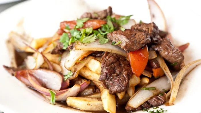 Almost as popular as ceviche, this chifa dish represents a fusion of Chinese stir-frying and classic Peruvian ingredients. Juicy strips of soy-marinated beef (or alpaca), onions, tomatoes, aji chiles, and other spices are stir-fried until the beef is just cooked and the tomatoes and onions start to form a robust, meaty gravy.